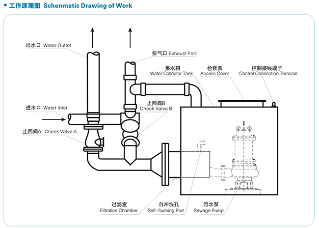 含有污物的生活污水靠白身重量, 由建筑生活排水管線進(jìn)入設(shè)備進(jìn)水口,當(dāng)經(jīng)過過施室時(shí),污水與污物進(jìn)行分高,污物暫存于過濾室內(nèi);通過過濾的污水經(jīng)水泵進(jìn)口反方向流入集水箱。當(dāng)集水箱的水位達(dá)到設(shè)定啟票水位時(shí),主泵啟動(dòng)(多泵設(shè)備主泵與副泵交替啟動(dòng)) , 污水泵吸取集水箱內(nèi)過滿后的污水利用出口壓力反沖洗過施室, 使過港室內(nèi)的污物隨壓力水流一起排入室外排水檢査并, 同時(shí)自沖洗孔對集水箱進(jìn)行清洗, 此時(shí)主泵端止回間B處關(guān)閉狀;態(tài)不會(huì)產(chǎn)生污水回流, 副泵端止回間 B為開啟狀態(tài)生活污水繼續(xù)流入設(shè)備, 當(dāng)集水箱內(nèi)水位降至停泵水位,主泵停止運(yùn)行,設(shè)備的一次排污過程結(jié)束。對于単泵設(shè)備運(yùn)行時(shí),污水可經(jīng)過其它過旋室連續(xù)流入設(shè)備內(nèi),不受水泵運(yùn)行與否的影響。